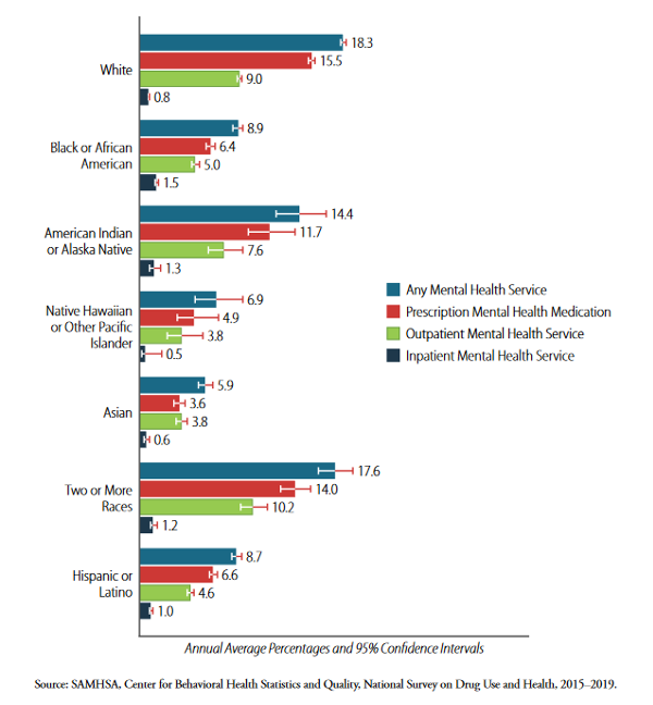 Figure 1: Mental Health Service Use in the Past Year among Adults, by Race/Ethnicity: 2015-2019, Annual Averages