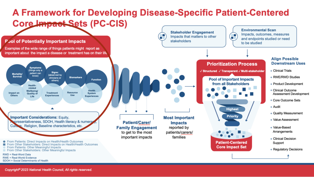 The Patient-Centered Core Impact Sets was created by the National Health Council (NHC). All rights reserved. This document may not be reproduced or distributed in whole or in part without express written permission from NHC. Nor may third parties translate, edit, modify, or otherwise create derivative works from the document. This document is provided for educational purposes only and should not be considered medical or legal advice. The document is provided “AS IS” without any warranties, express or implied, and NHC expressly does not warrant the accuracy, fitness, merchantability, safety, or usefulness for